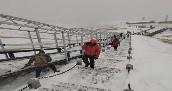 由于工期紧,任务重。11月中旬又紧急从西景区前勤、西集散及运营部、南景区抽调人手支援,这些精兵强将在施工期间不仅要克服高强度劳作带来的身体疲惫,还要适应主峰气温低的考验。即便寒风刺骨、冻得手指僵硬,他们也始终坚守岗位、毫不松懈。尤为动人的是,他们以雪为令,即下即清,确保长廊施工不受影响;他们心往一处想、劲往一处使,全力推进工程进度,只为能让游客早日登台阶看天池。