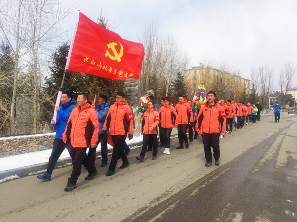 在随风飘扬的党旗下,大家步行体验革命先烈走过的抗联路,用手中的铁锹和扫帚,清理周边落叶枯枝和积雪,为革命先烈纪念碑营造干净整洁的环境。
